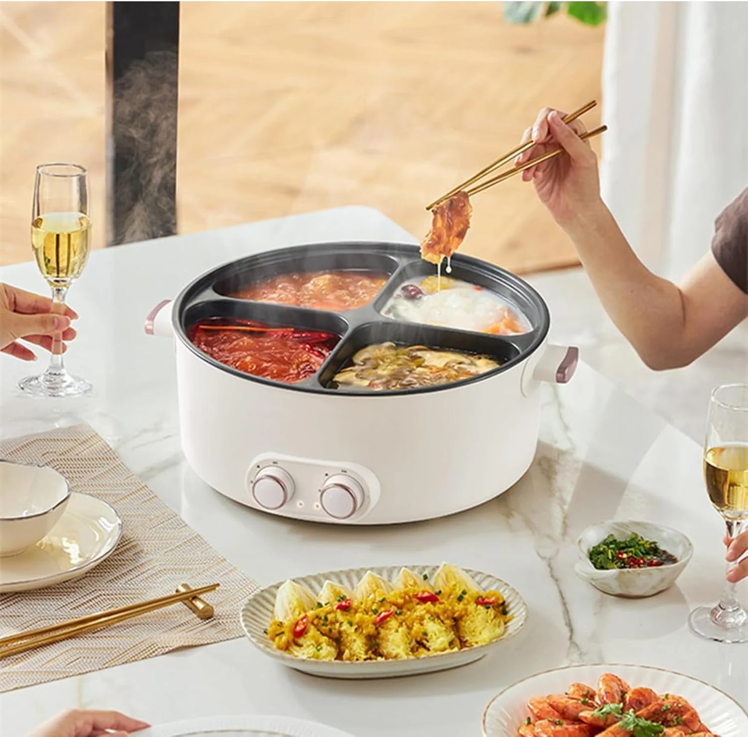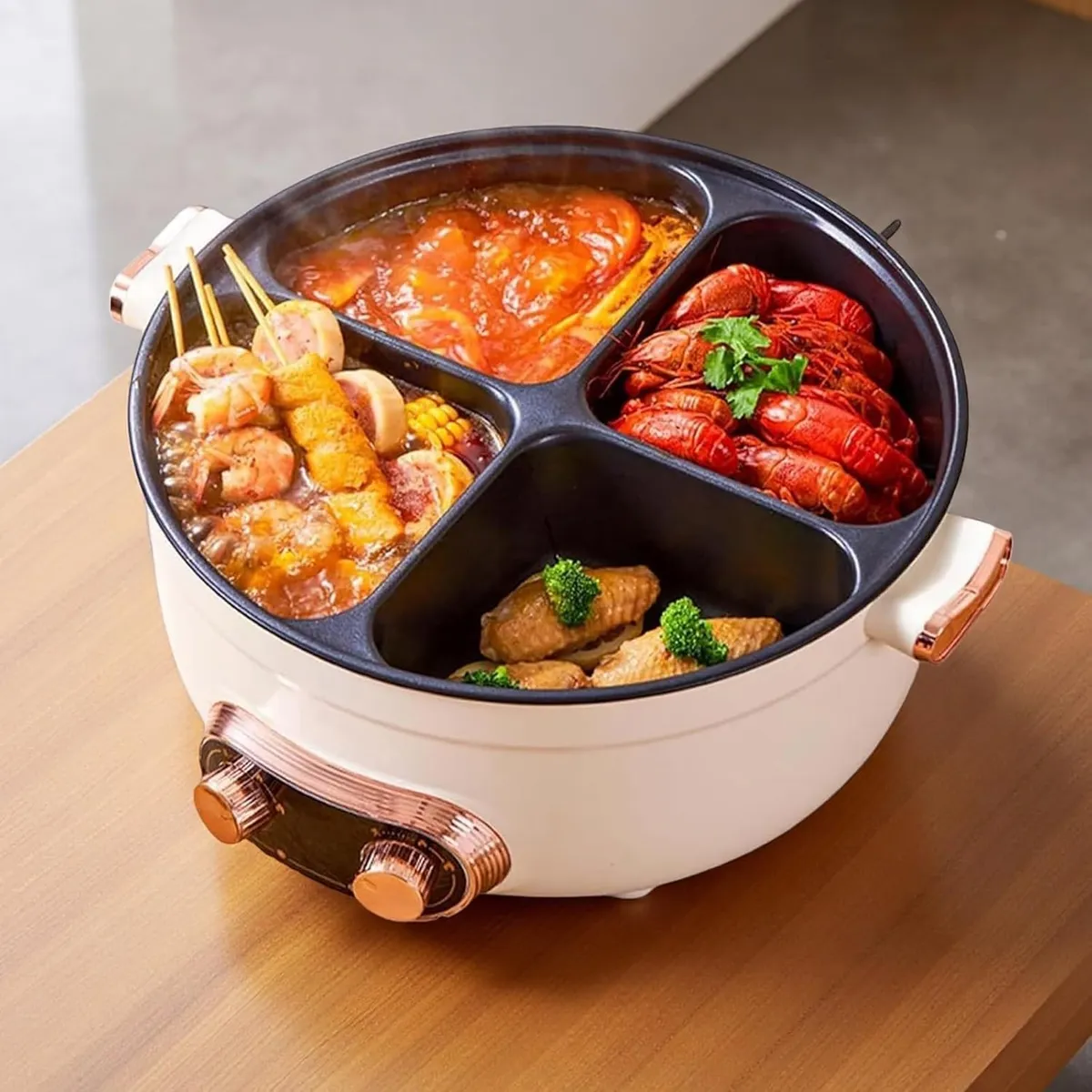 Panela elétrica multifuncional com 4 divisórias de sabor — cozinhe diferentes bases de sopa, ensopados e fondue simultaneamente. Grande capacidade de até 7 litros, aquecimento ultrarrápido de 2.000W e proteção inteligente contra queima a seco.